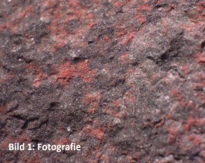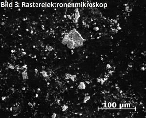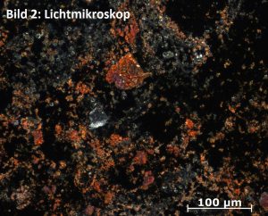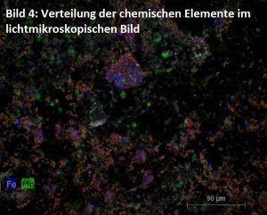 Zur Aufklärung in derart mehrdeutigen Fällen reicht eine Untersuchungsmethode nicht aus. Deshalb kann imq den Kunden mit der korrelativen Mikroskopie helfen, die die Vorteile der Lichtmikroskopie mit den Möglichkeiten der Rasterelektronenmikroskopie (REM) verbindet. Eine Untersuchung am REM gibt Auskunft über die chemische Zusammensetzung in kleinsten Bereichen. Leider geht bei diesem Verfahren die Farbinformation verloren (vgl. Bild 2 und 3). Wenn die Stoffzusammensetzung jedoch von exakt den roten Belägen gesucht wird, dann muss die Stelle im REM sicher wiedergefunden und analysiert werden können. Im Beispiel wurde dann tatsächlich in den roten Belägen Eisen und Sauerstoff gefunden (Bild 4).
